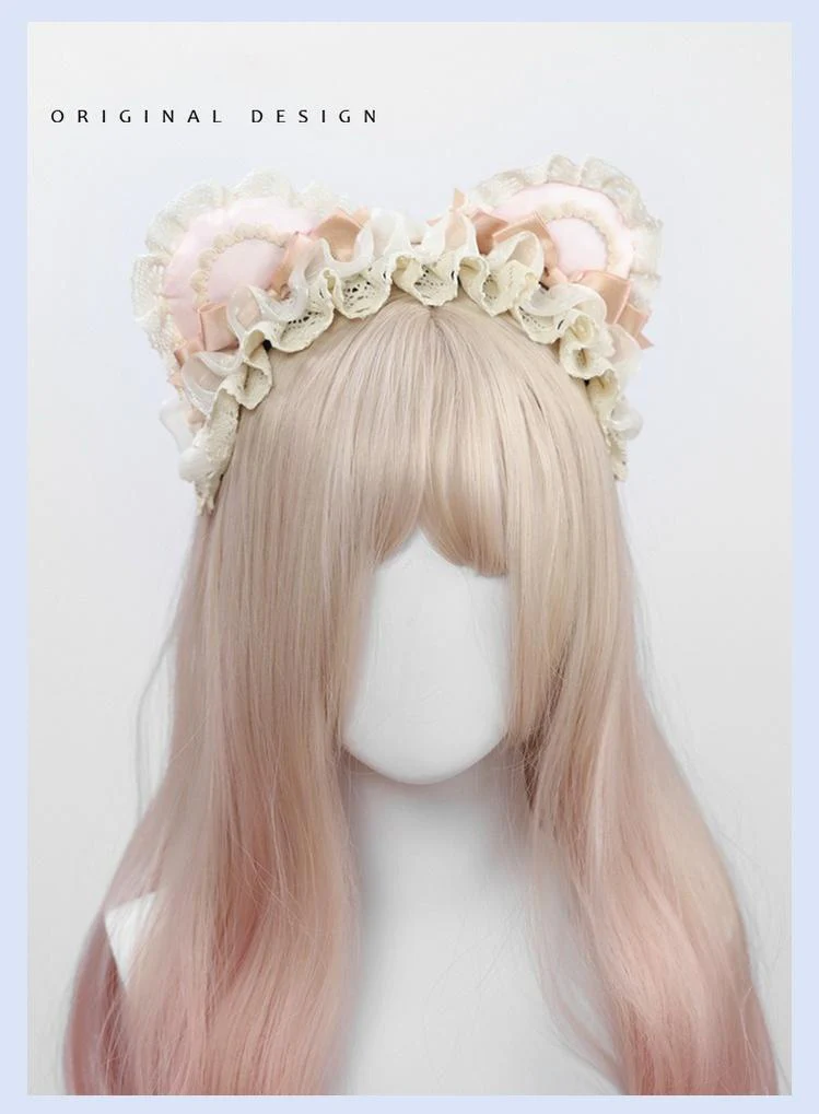 - This Sweet Lolita head accessory set features soft pastel tones, ruffles, and bear ear details for a whimsical touch.