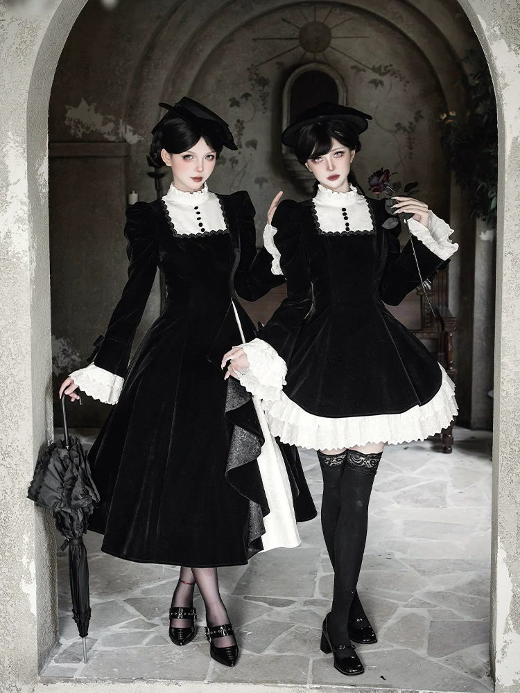 - Classic Lolita OP in Black and White: Retro and elegant with a color-block stand collar and puffed sleeves.