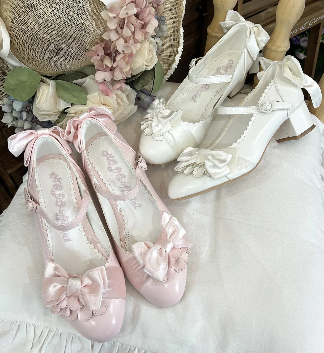 - Classic Lolita shoes with horseshoe heels offer stable wear with a very vintage look, and ribbon bows for details.