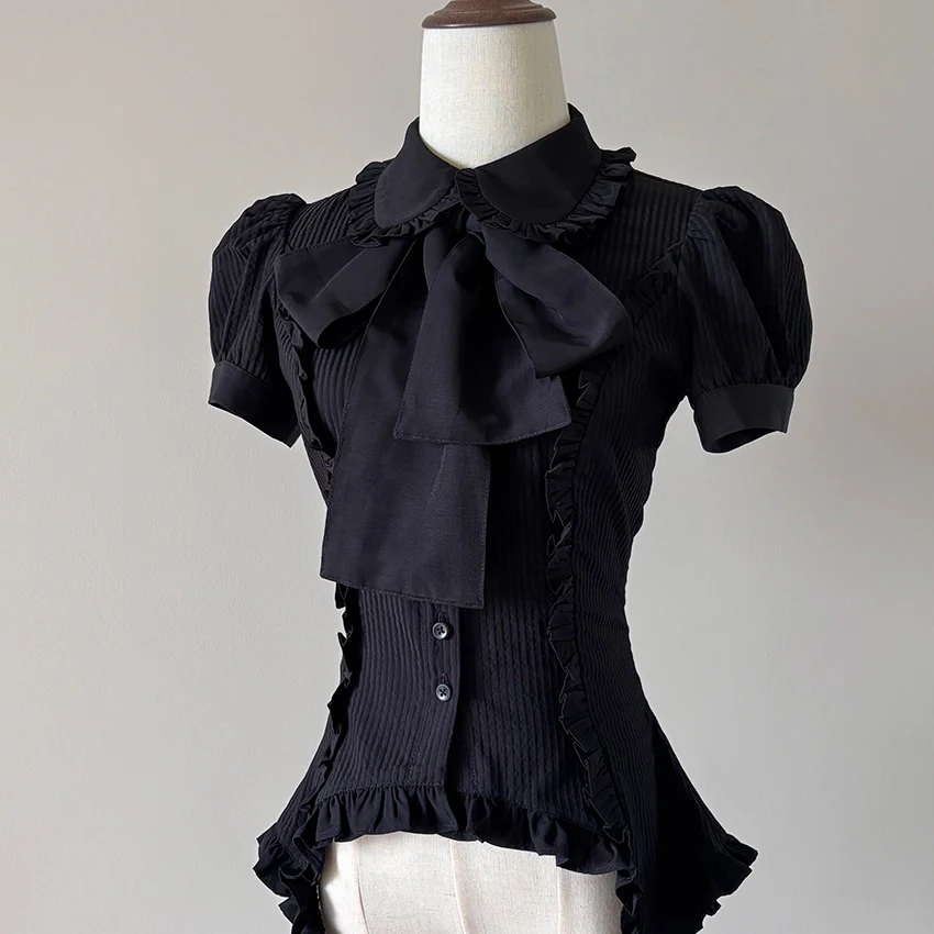 FlowerFairyDaily - Lilith - Gothic Lolita Short Sleeve Shirt, Detachable Tie—