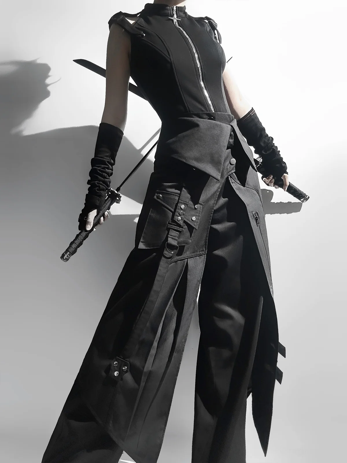 - Top: Sleeveless design, the shoulders are made of two adjustable straps, slim fit with a cross-star zipper.