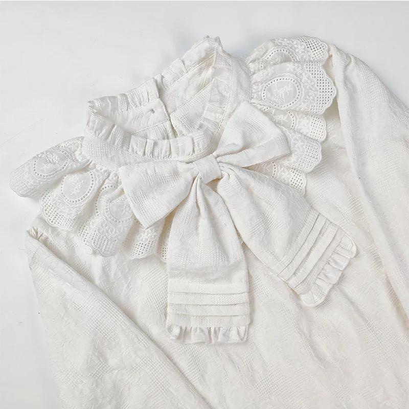 - Sweet Lolita shirt, designed with a round ruffle collar, big bow in the middle front, and flare sleeves.