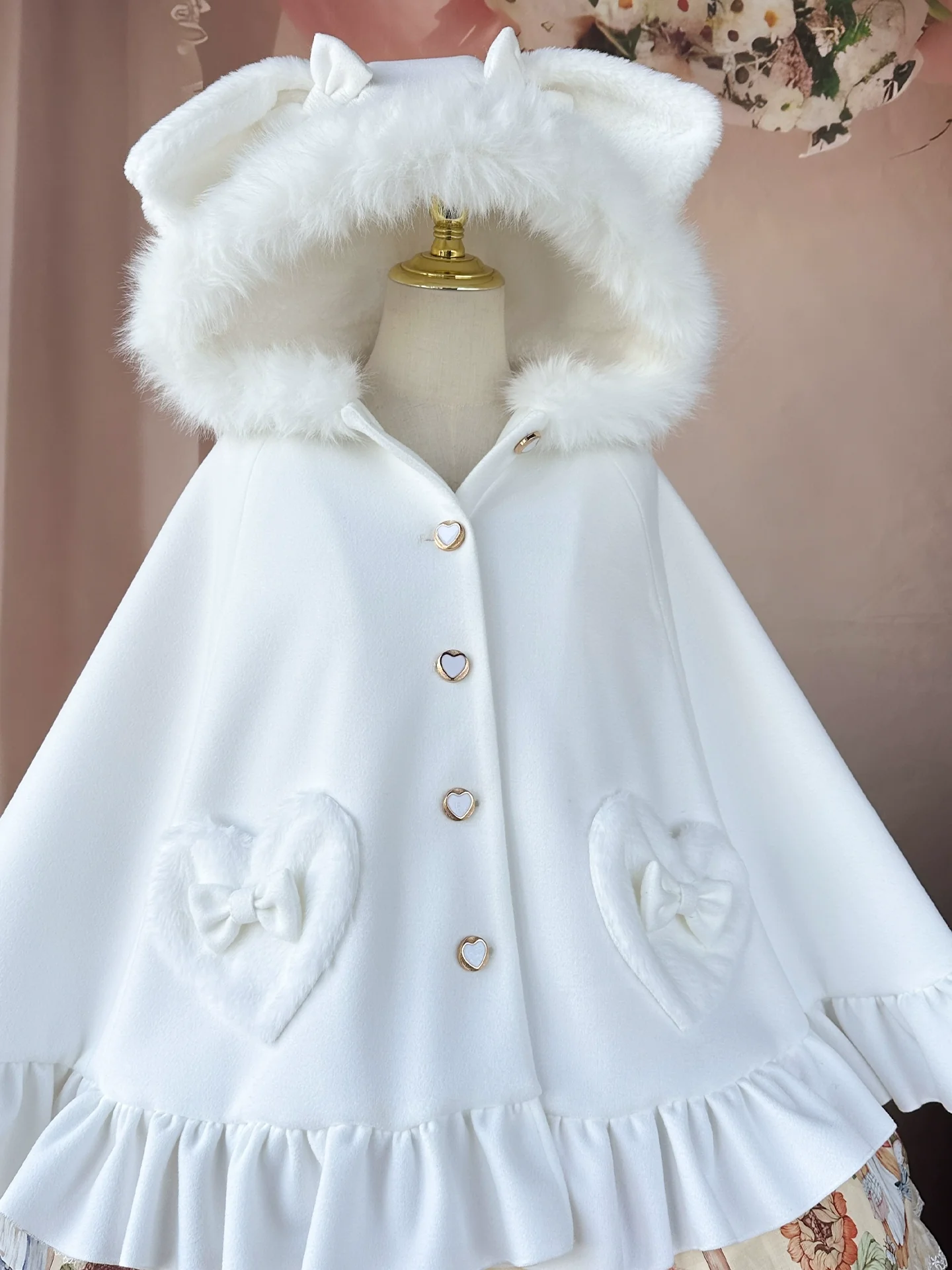 - This Sweet Lolita cape features a ruffle hem and adorable bow accents, along with a fluffy hood adorned with cute bunny ears.